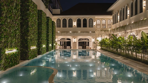 Surrounded by tropical plants and Scandinavian-inspired arches, it offers a tranquil escape with cozy poolside seating perfect for relaxing day or night.