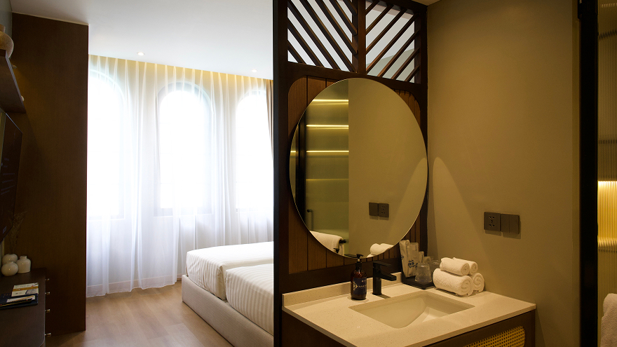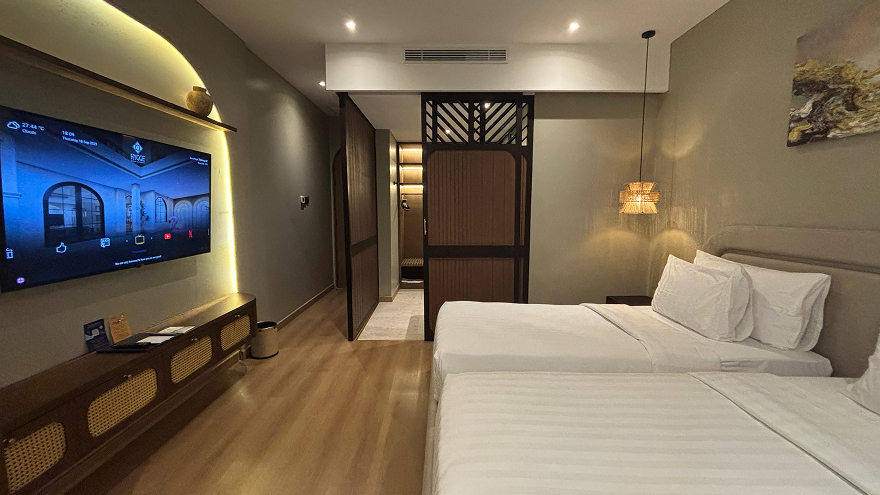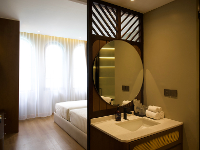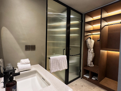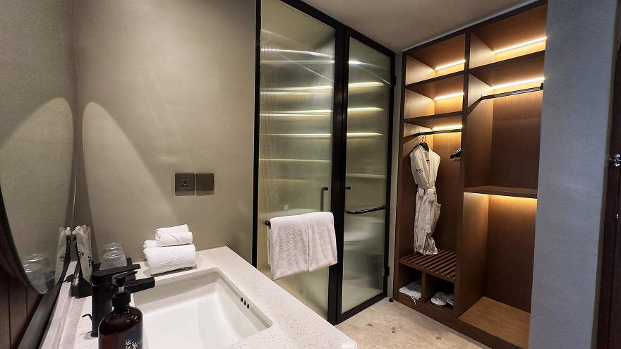 The bathroom features a sleek layout with smooth light-toned floors, emphasising calmness and warmth with custom wooden cabinetry and minimalist towel racks. The rainfall shower and thoughtfully placed amenities offer ultimate functionality.