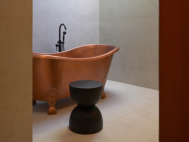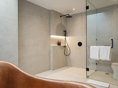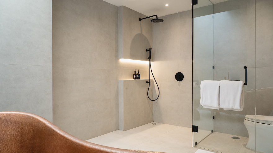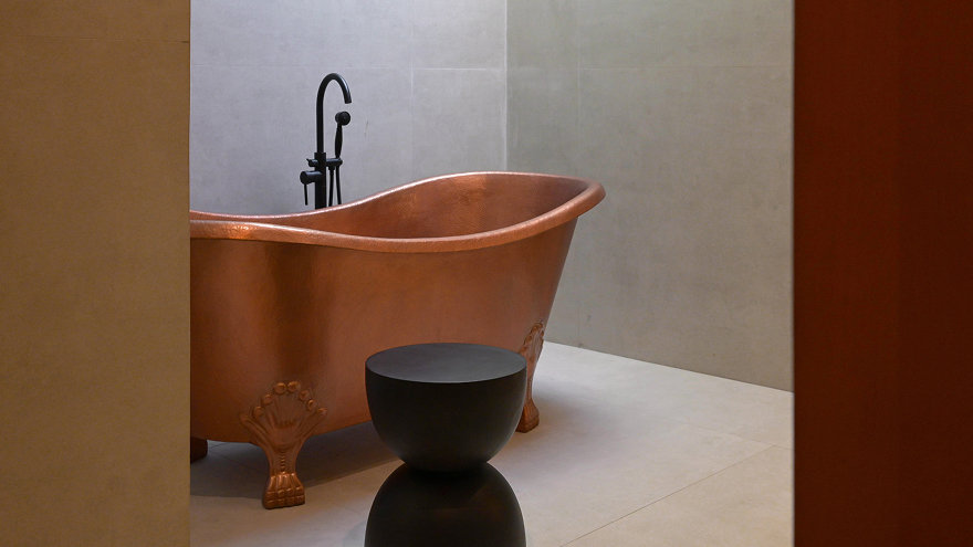 Designed with both style and serenity in mind. Featuring clean, minimal lines, soft-toned walls, and warm wood cabinetry, it creates a calming spa-like escape for the whole family. A standout freestanding copper tub adds a luxurious touch, while the rainfall shower and thoughtfully placed amenities offer ultimate functionality.