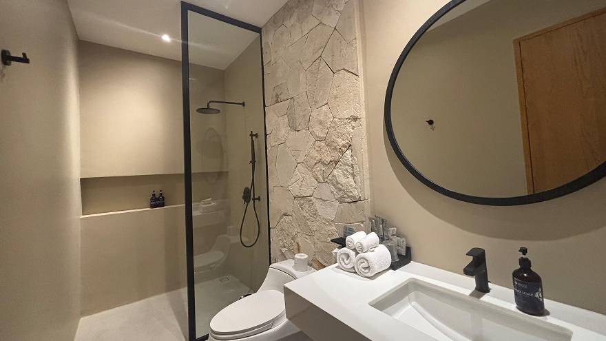 The bathroom features a sleek layout with smooth light-toned floors, emphasising calmness and warmth with custom wooden cabinetry and minimalist towel racks. The rainfall shower and thoughtfully placed amenities offer ultimate functionality.