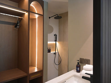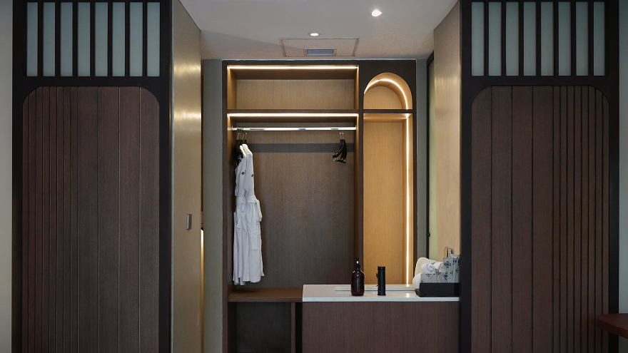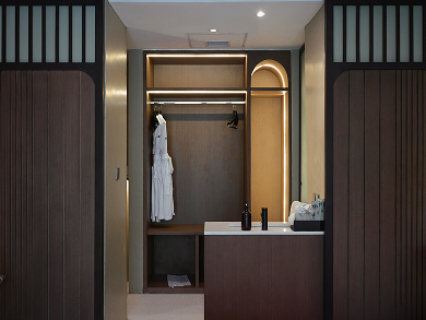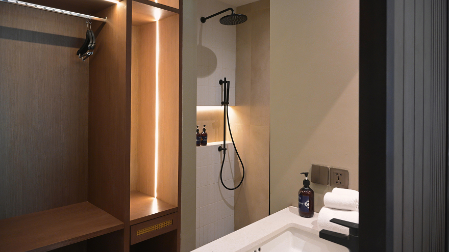 The bathroom features a sleek layout with smooth light-toned floors, emphasising calmness and warmth with custom wooden cabinetry and minimalist towel racks. The rainfall shower and thoughtfully placed amenities offer ultimate functionality.