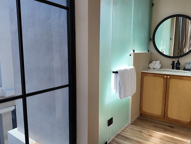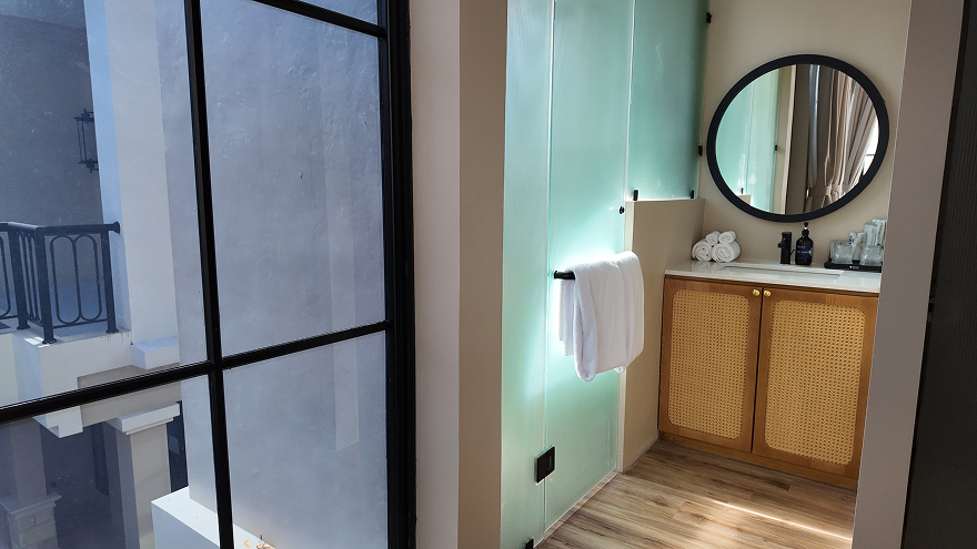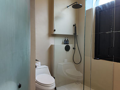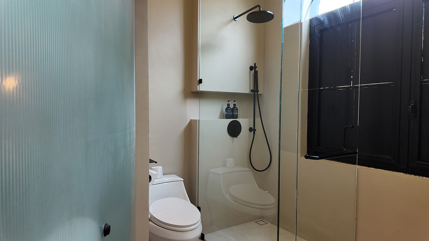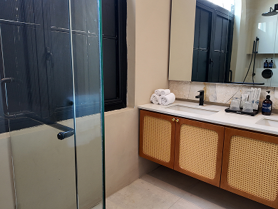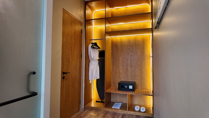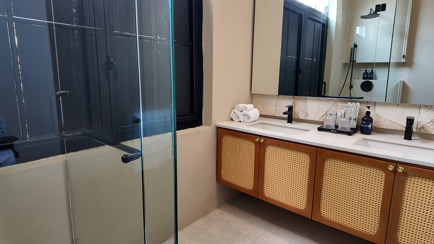 The bathroom features a sleek layout with smooth light-toned floors, emphasising calmness and warmth with custom wooden cabinetry and minimalist towel racks. The rainfall shower and thoughtfully placed amenities offer ultimate functionality.